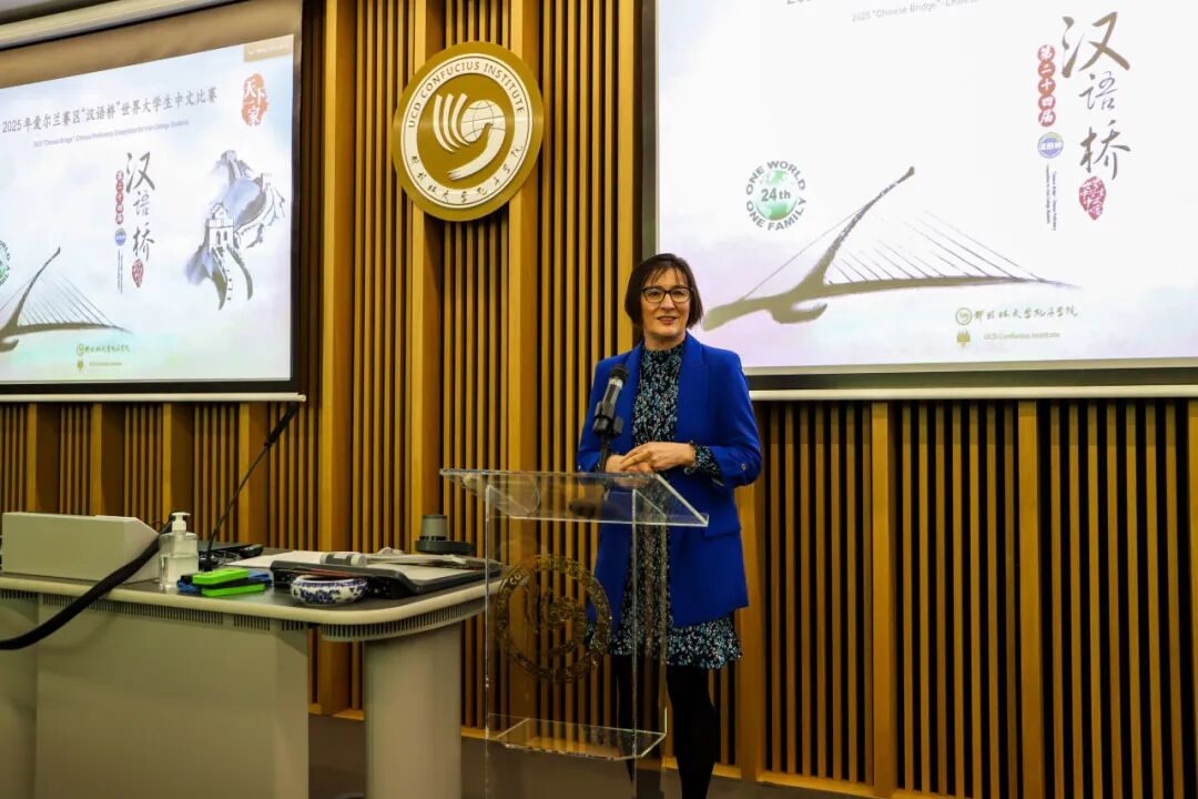 在致辞环节,都柏林大学副校长Dolores O’Riordan向获奖选手表示祝贺。她对获奖选手表示热烈祝贺,并指出,中文不仅是中爱两国人民交流沟通的重要桥梁,更是推动文化交流的关键纽带。