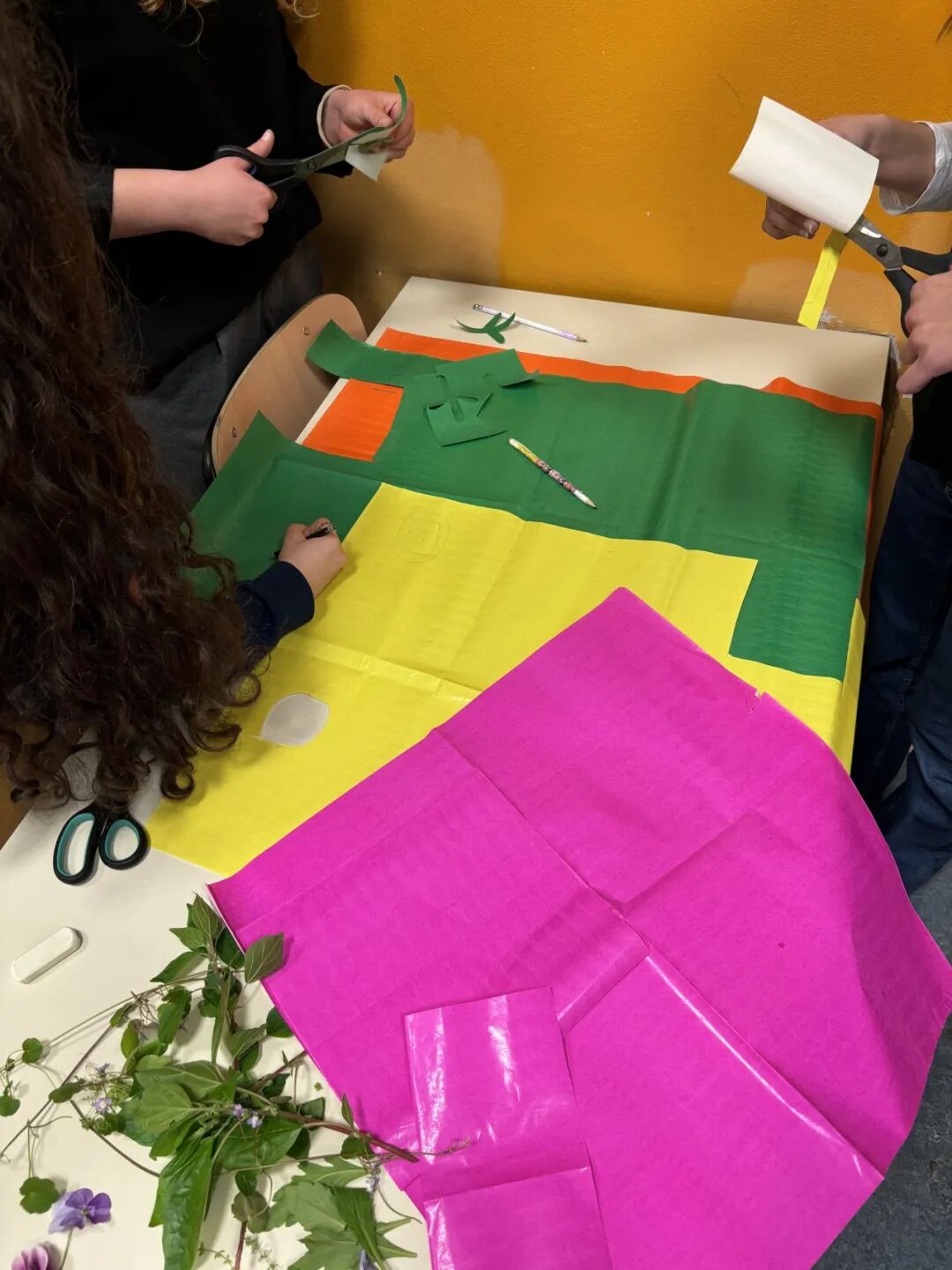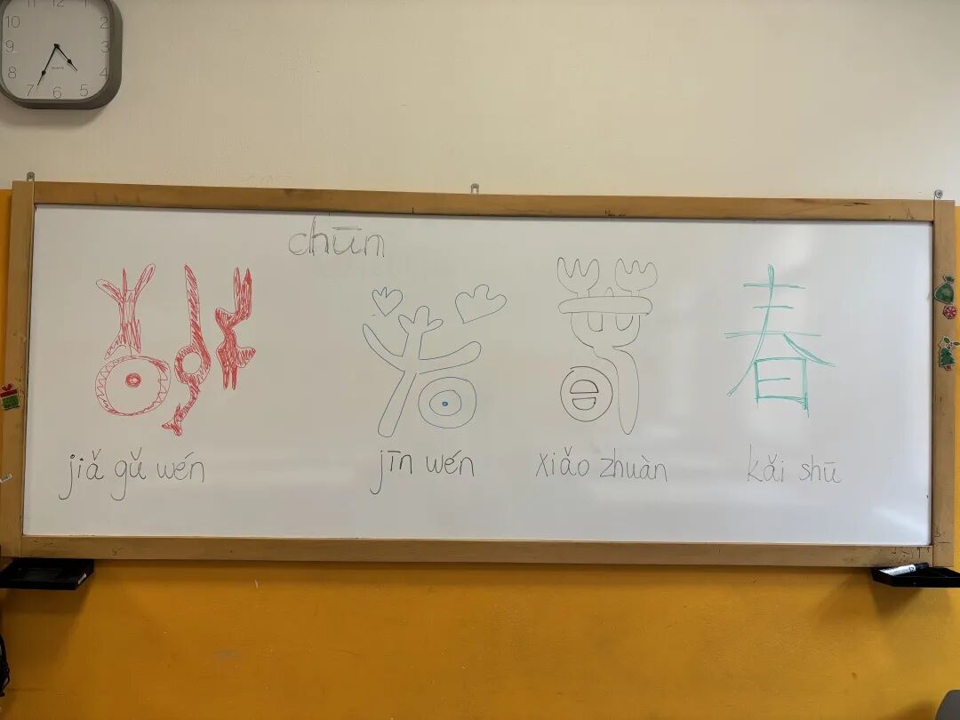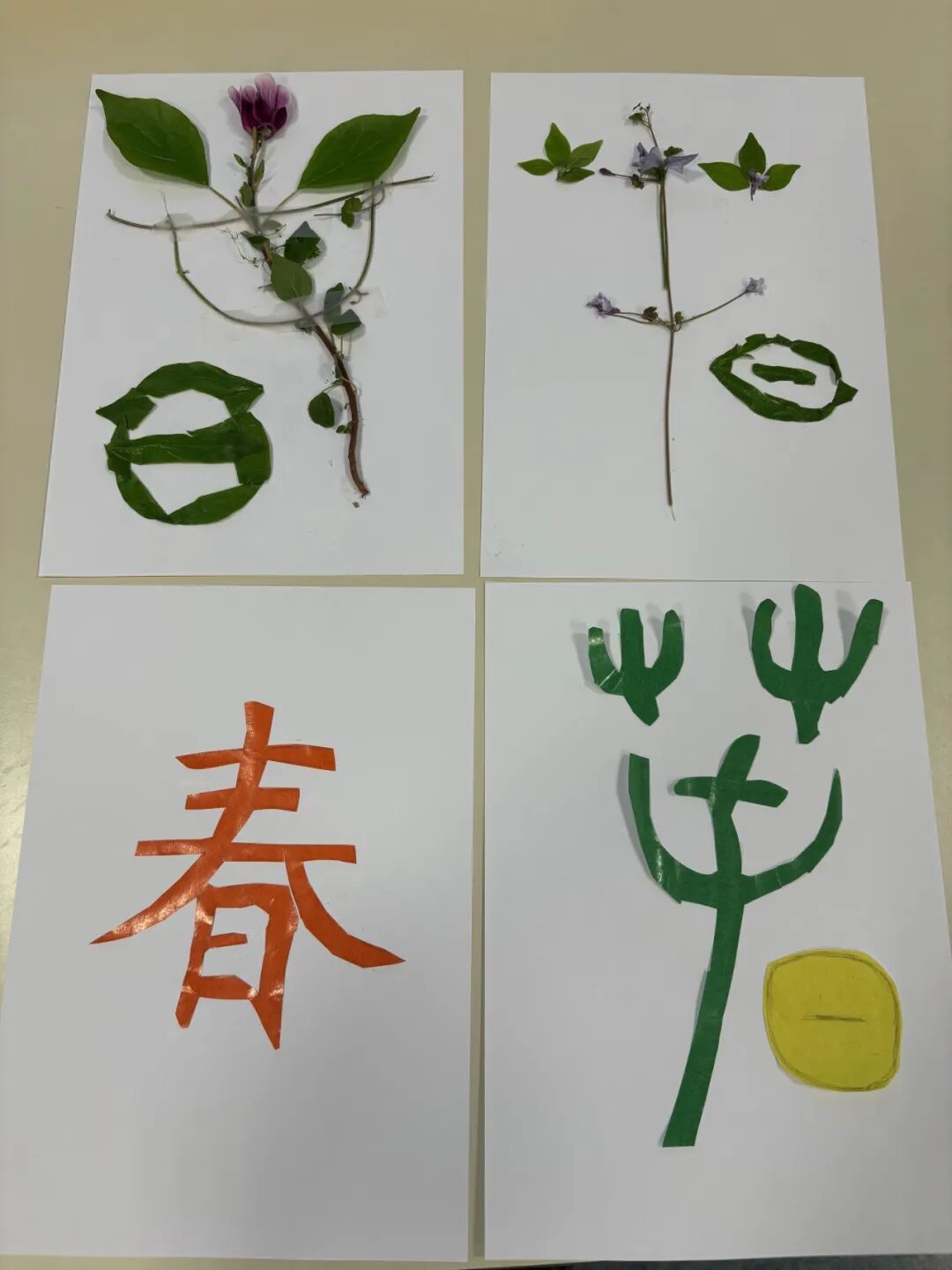 在包老师的引导下,学生们在黑板上描摹着“春”字的演变轨迹。从甲骨文,到金文,小篆,再到楷体。象形性虽逐渐减弱,艺术美却愈发清晰可见。随后,师生们走出教室,在校园里采撷野花野草,并挑选自己最喜欢的“春”字造型,用手中的花草编织、拼贴,创作出一个个独具个性的“春”。现实世界的春意,被他们用艺术的方式转化为文字的诗意。最后,包老师讲述了仓颉造字的传说。她问学生们是否相信这个神话。学生们认真地思索后回答:他们愿意相信其中的精神意义,但也认为汉字应是几代先人智慧的累积和传承。那一刻,语言的力量跨越了国界,文化的种子在春日的土地里悄然生根发芽。
