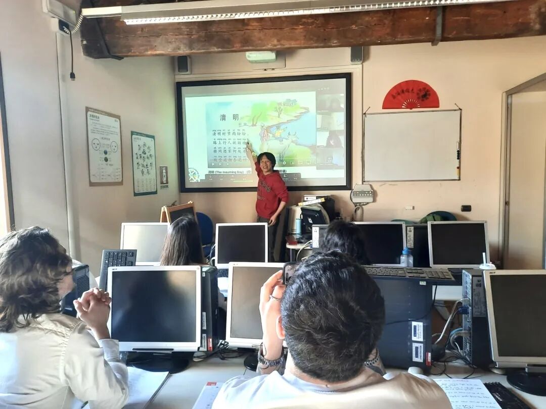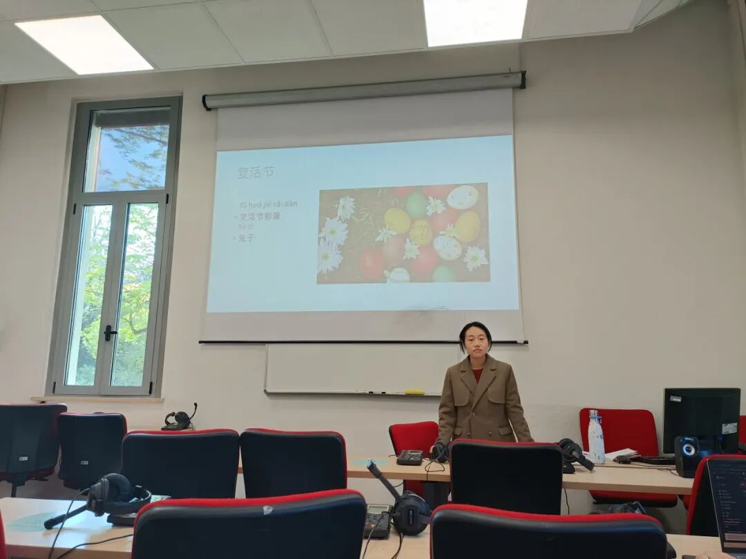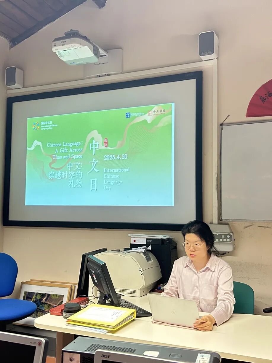 屈开新老师是2024年10月新加入博洛尼亚大学孔子学院的公派教师。在今年的“国际中文日”来临之际,在屈老师的课堂上,她首先为大家讲解了“国际中文日”的由来。她介绍道,“国际中文日”由联合国于2010年设立,每年定于4月20日,是因为这一日接近“谷雨”节气,传说中也是中华民族的文字始祖——仓颉造字的日子。随后,向学生们展示了“中文联盟”平台上的丰富学习资源。通过“中文联盟”网站,学习者不仅可以在线学习汉字、词汇、语法,还可以参与文化体验课程,极大地激发了学生们学习汉语的兴趣和热情。