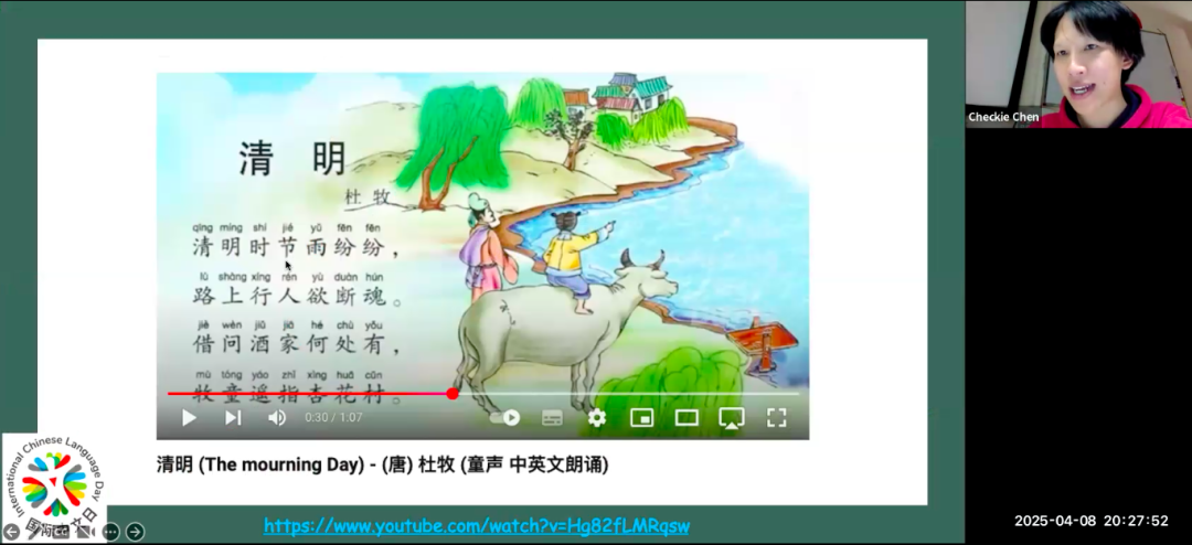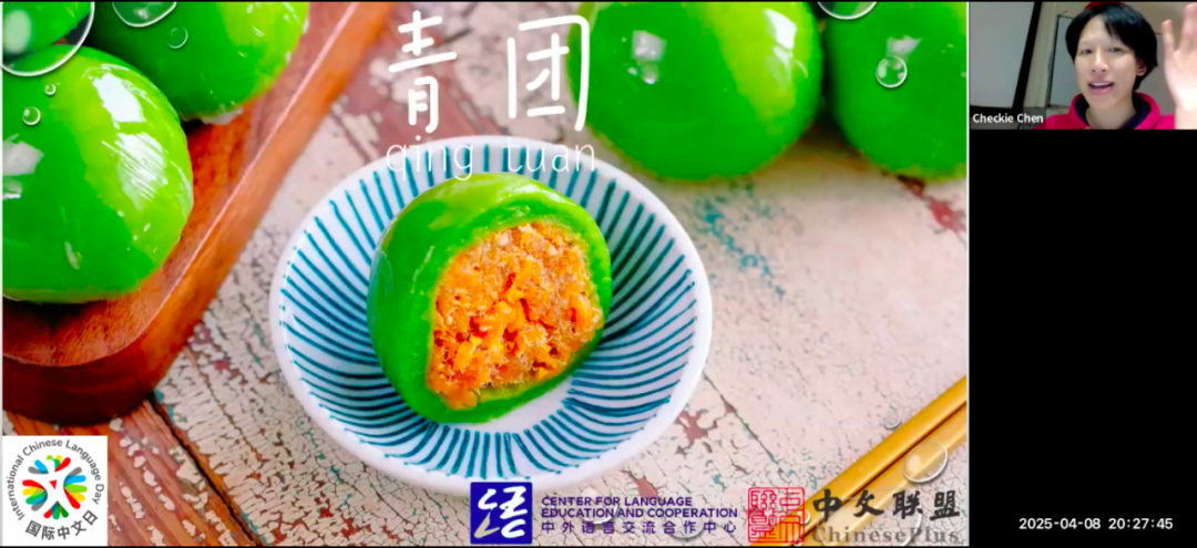 在国际中文日的教学活动中,陈黄超老师发挥专业优势,以清明节作为纽带,为线上线下的学生们精心打造了一场沉浸式文化体验课程。课程伊始,陈老师阐释了清明节作为传统节日与二十四节气在文化内涵与时间维度上的双重意义。随后,借助多媒体教学手段,通过视频呈现了青团制作的全过程。从艾草汁调配出鲜艳的翠绿面团,到精细包裹甜馅形成玲珑团子,每一个步骤都精准展示,充分彰显了东方美食所蕴含的文化魅力。此外,陈老师还对杜牧的《清明》进行了细致入微的解读。在交流环节,来自意大利、俄罗斯、法国、比利时、阿根廷以及委内瑞拉的学生纷纷结合自身国家的文化传统,分享了与清明时节主题相近的独特习俗。此次活动促进了多元文化的理解与尊重,为本次国际中文日活动增添了浓墨重彩的一笔。