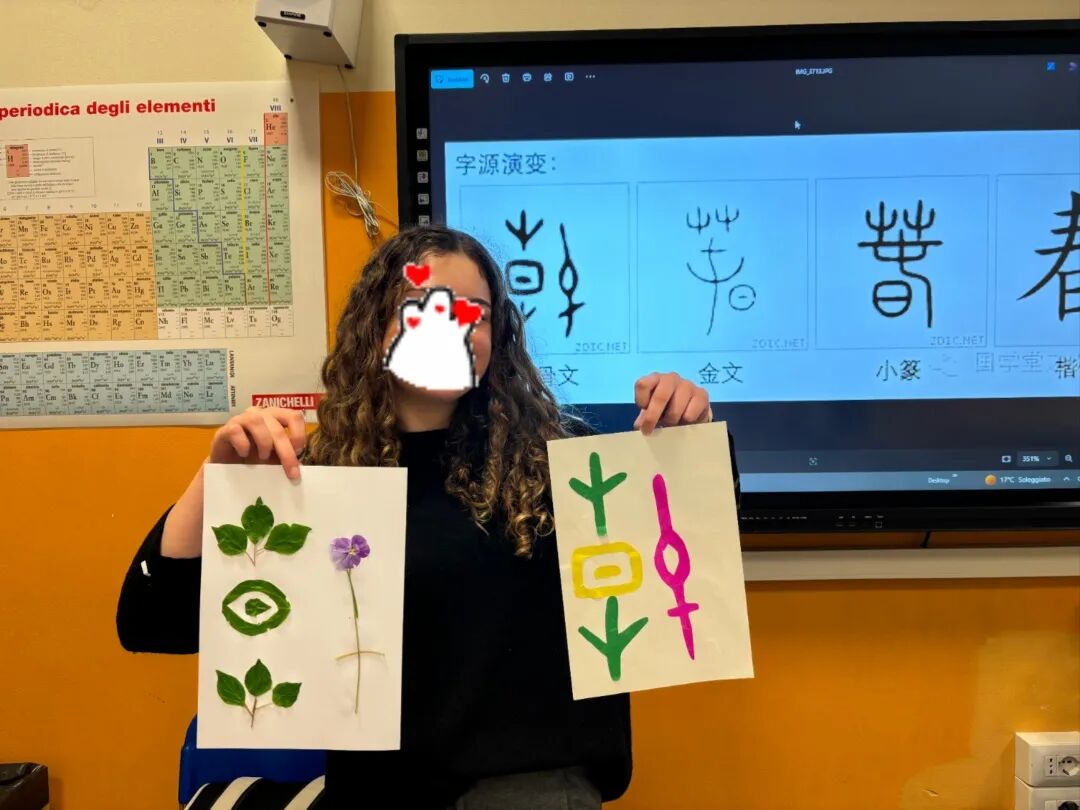 包立颖老师目前担任博洛尼亚大学孔子学院公派教师岗位。课堂上,她带领A1班的学生们,以“汉字与春天”为题,用笔画与自然共绘春光。课堂伊始,包老师轻声问道:“在你们心中,春天是什么样子的?”学生们纷纷回答——青青的草地、缤纷的野花、抽出嫩芽的树木、温暖和煦的阳光……这些春日的印象,恰巧拼成了甲骨文的“春”字。这一刻,学生们惊讶地发现,原来几千年前的汉字创作者,和他们此刻的感受竟如此相似。