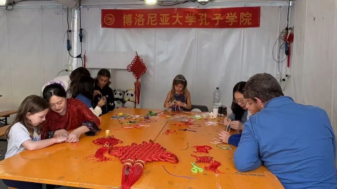 随后,活动进入了中国结制作环节。一根根普通的红绳,在孔院老师的巧手编织下,变成了象征团结、吉祥的美好结饰。从基本的平结到更为复杂的造型,老师一步步地进行分解教学。孩子们全神贯注,家长们也积极参与其中,互相帮助。当一个个亲手编织的中国结完成时,现场充满了成就感与欢声笑语。小小的中国结,不仅编织出了精美的工艺品,更编织起了中意文化交融与理解的纽带。