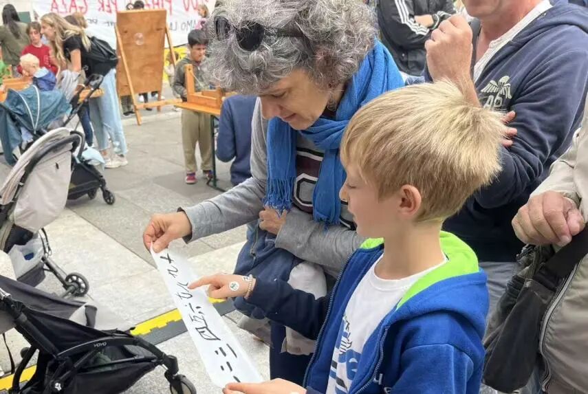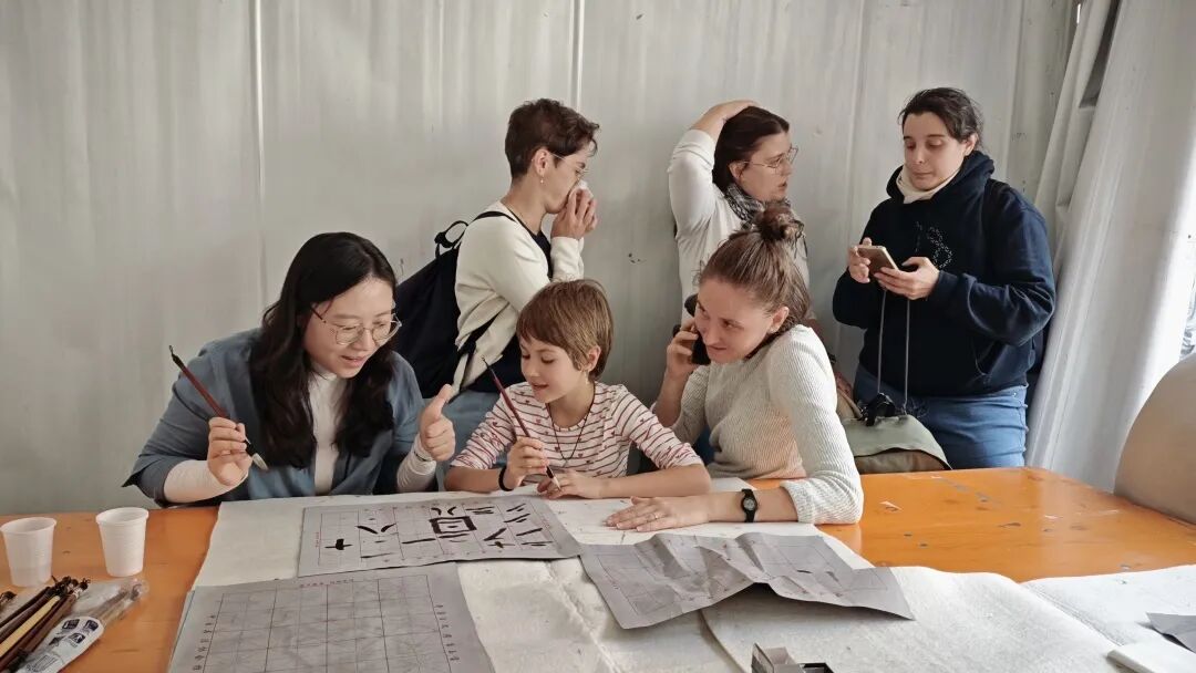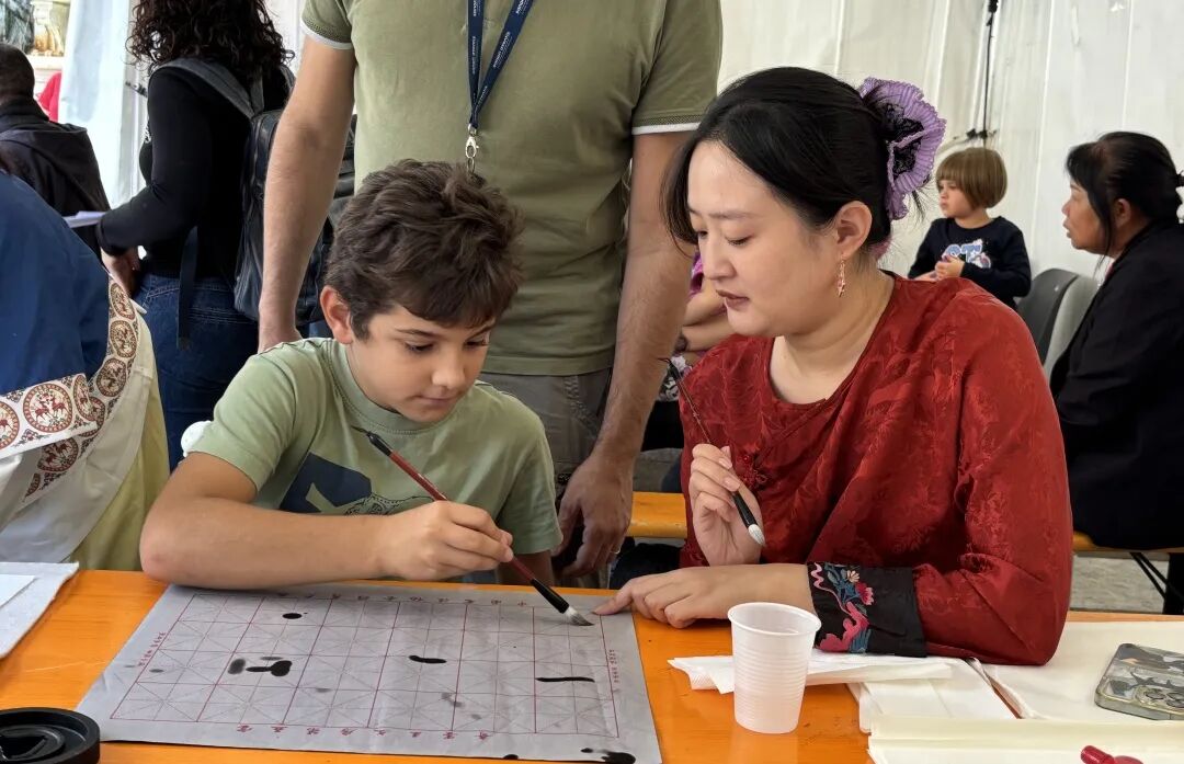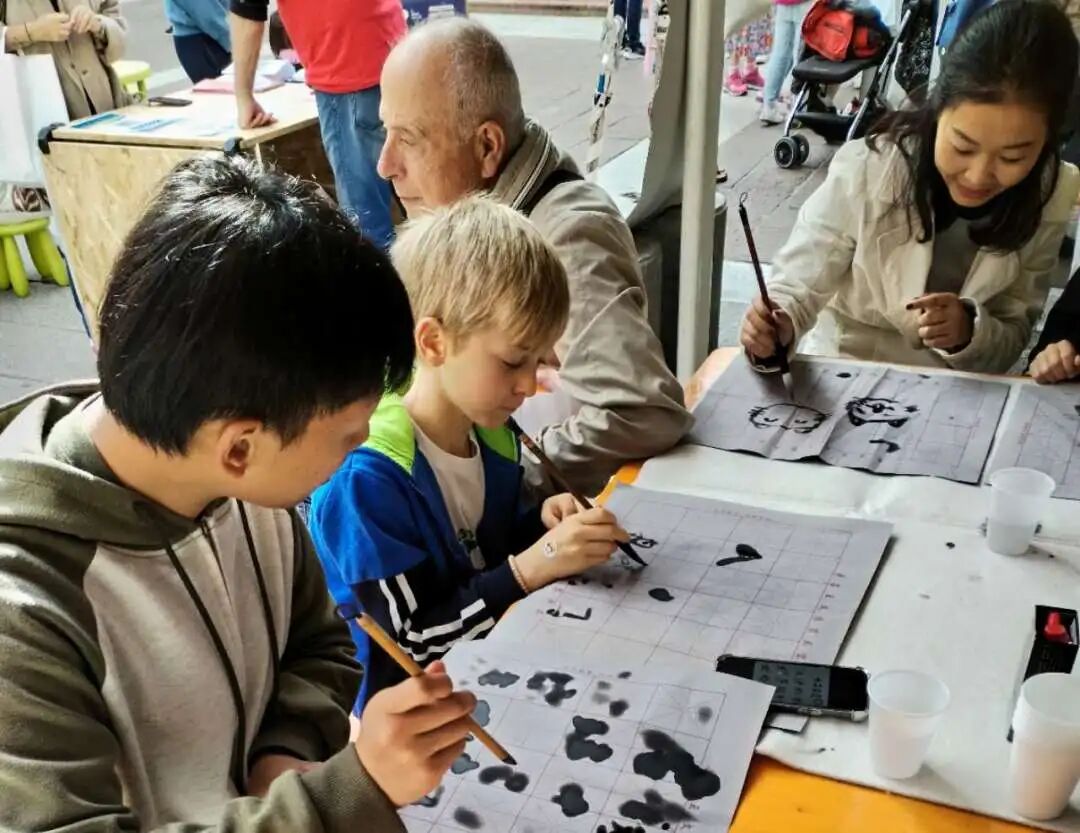上午十时整,活动在悠悠墨香中准时拉开帷幕。书法体验区瞬间成为了众人瞩目的焦点。在孔院老师们的悉心指导下,参与者们,特别是小朋友们,从最基础的握笔姿势、运笔方法学起。老师们一边进行着娴熟的演示,一边细致入微地讲解汉字的结构以及书写所蕴含的神韵。孩子们个个兴致盎然,在洁白的宣纸上,一笔一划地认真练习,不仅顺利书写出了“一”“二”“三”等简单的中文数字,更有不少孩子成功写出了自己的中文名字,脸上洋溢着满满的自豪与喜悦。家长们有的在一旁不断鼓励孩子,有的也按捺不住内心的好奇,纷纷拿起毛笔,与孩子们一同感受中国书法的独特魅力。