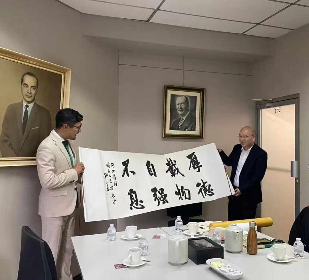 代表团走进哥大文学院,与院长弗朗西斯科·格瓦拉·奎尔博士(Dr. Francisco Guevara Quiel)会谈。双方就文学艺术交流、语言教学合作展开深入讨论,并表达了在新学期通过线上平台开展艺术与文学互动的愿景。