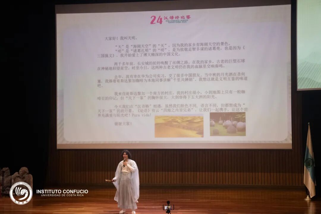 入围决赛的八名选手围绕主题“天下一家”,进行了声情并茂的主题演讲和精彩纷呈的中华才艺展示。选手们不仅分享了中文学习改变人生的动人故事,表达了在中哥文明间找到共鸣的欣喜,更展示了卓越的才艺:有的被誉为“哥斯李白”,用诗歌带观众畅游哥国;有的深情演绎中文歌曲《青花瓷》;有的创作油画作品赠予孔院;有的自创中文歌曲,在诗情画意里把观众带入浪漫的爱情故事,等等。比赛现场气氛热烈,掌声不断。