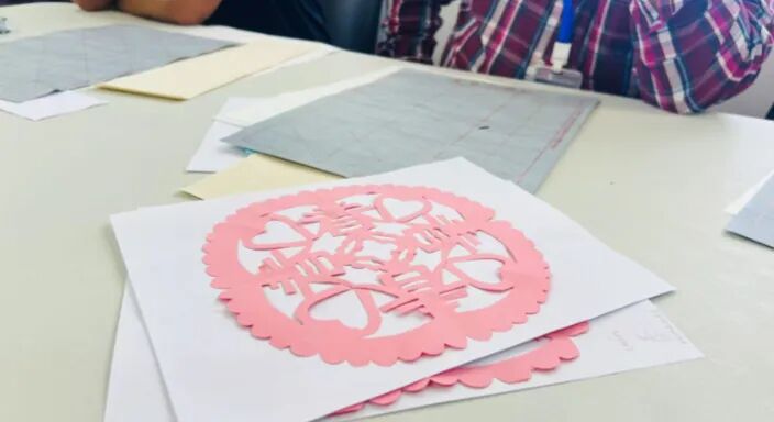 在殷久涵老师与吴昀美老师的耐心指导下,学员们跃跃欲试,纷纷动手操作。一张张彩纸在手中翻折,一剪一划之间,“春”字剪纸悄然成型。当精美的图案呈现在眼前时,学员们纷纷表示惊喜与喜爱,感叹传统艺术中所蕴含的智慧与美感。