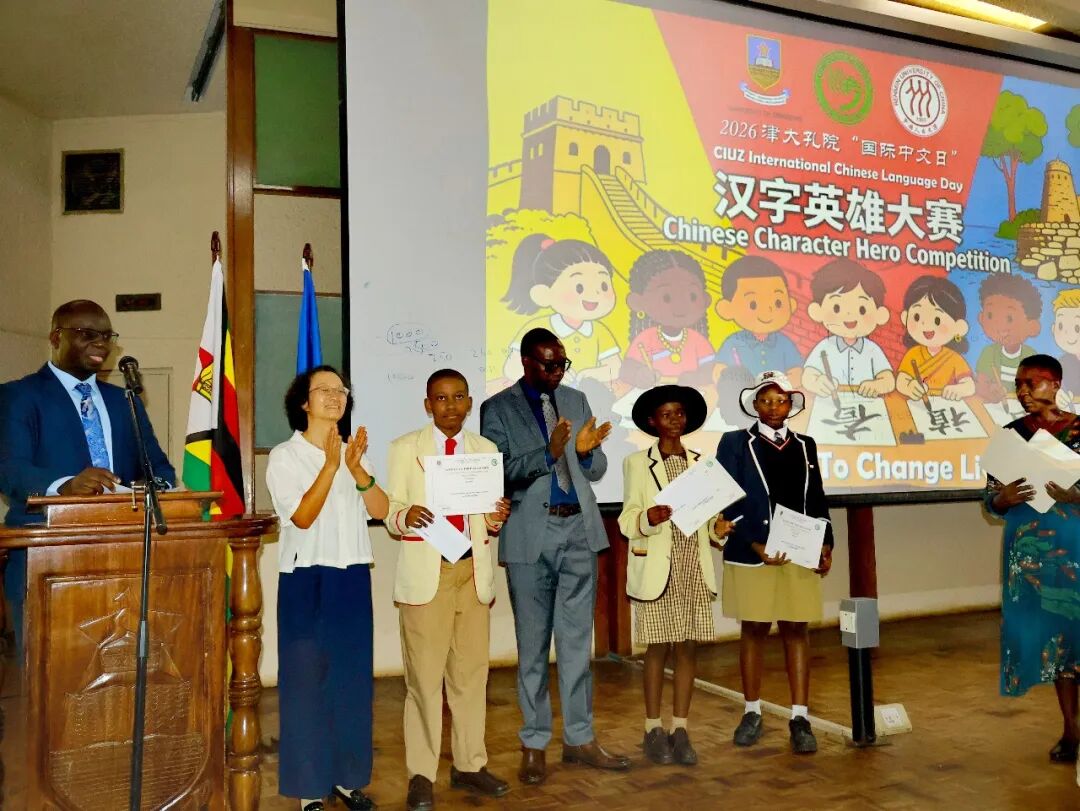 3月27日,周鼎大使出席2026年津巴布韦大学孔子学院“国际中文日·汉字英雄大赛”并致辞。津大人文学院院长曼格纳、孔院师生等近300人参加。