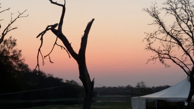 我们送别了河谷的静谧落日,围坐在茅草屋的昏暗灯光下吃晚餐。突然断电了,只有比星光稍亮的一盏应急灯。黑暗中,我们面对面坐着,我始终不知道那道美味甜品的全貌是怎样的,但好像我们心与心距离很近。此时,置身于野生动物栖息地中间的一片开阔河谷,远处传来野兽的低鸣,也许是角马或大象,还有沼泽地里的栖鸟啾鸣。好像有电也好,没电也好,月光已经足够我们欣赏自然的美了。这样的生活也自足优雅,我们随遇而安,回归最久远的人类作息,不再索求什么,心里已经很踏实了。
