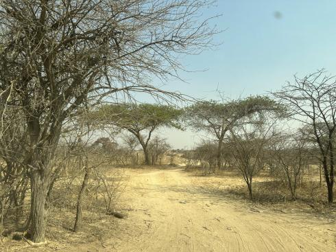 出发时窗外还是参天大树,在广袤的土地上舒展郁郁葱葱的树冠。这里土地广袤、鲜有人占据,每株大树只要有足够的水分就能够尽情舒展腰身。时不时地在郁郁葱葱的树冠之间还能看到一团团淡紫色的蓝花楹。几次颠簸,窗外的景象已经过渡到了广袤无垠的青黄,偶尔矗立着圆圆树冠的低矮树木。再往西南走,旷野上的荆棘树林长满密密麻麻的白色尖刺,至此我才更加懂得哈拉雷市区的植被有多美。偶尔有一团盘绕在树枝上的槲寄生,或者无花果形状的鸟窝悬挂在枝头。我们在一片荒芜中拐进了羚羊公园,在日落之前体验了第一次Safari。我们坐在高高的货车改造的Safari车上,前后左右寻找羚羊、野牛、长颈鹿的身影。