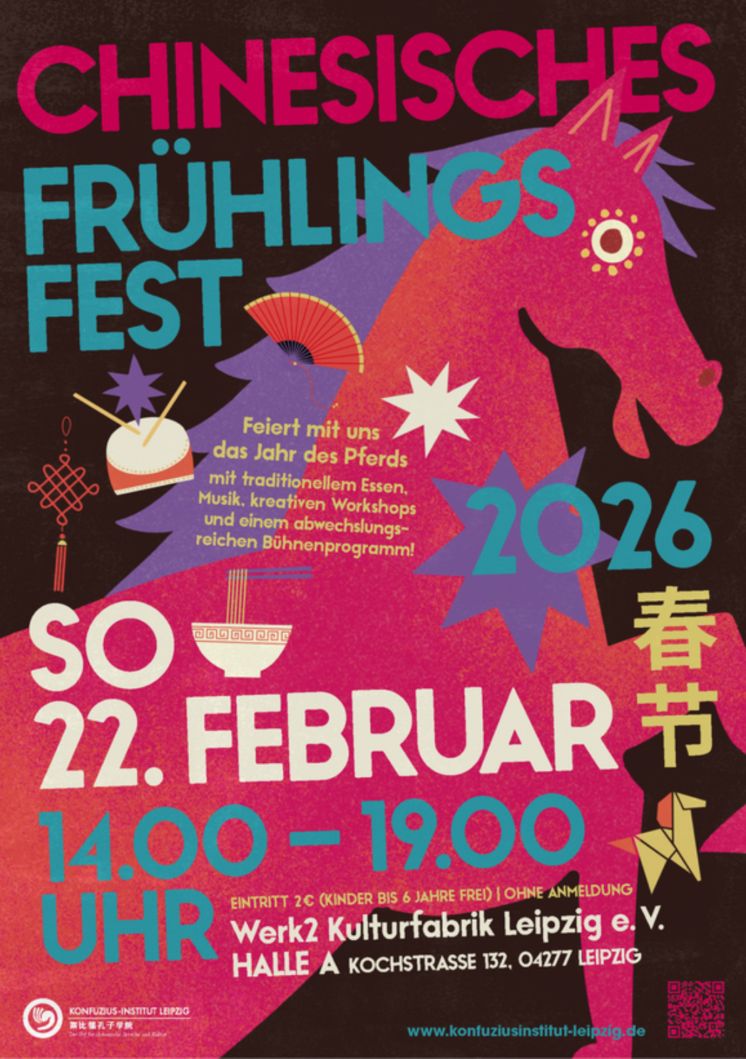 Am 22. Februar 2026 laden wir euch herzlich ein, gemeinsam mit uns im Werk 2 – Kulturfabrik Leipzig e.V. das Jahr des Pferdes zu begrüßen. Von 14:00 bis 19:00 Uhr erwartet euch in Halle A ein vielfältiges Programm: authentische Speisen, kunsthandwerkliche Stände mit kreativen Arbeiten und ein abwechslungsreiches Mitmachangebot für Groß und Klein. Bringt auf jeden Fall Hunger mit!
