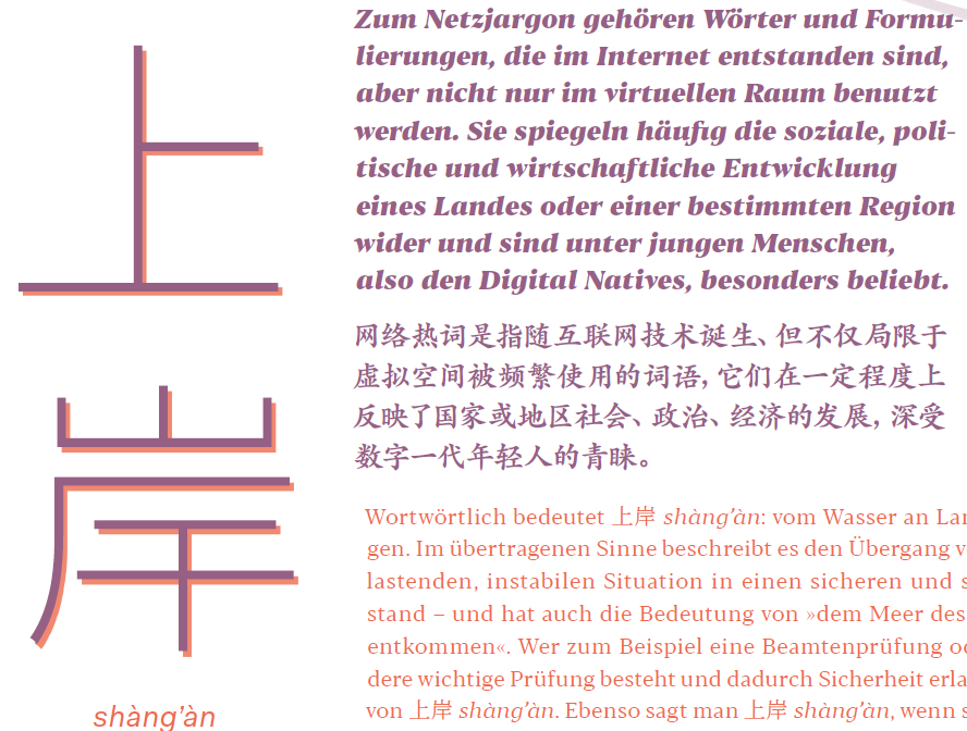 Wortwörtlich bedeutet 上岸 shàng àn: vom Wasser an Land zu gelangen. Im übertragenen Sinne beschreibt es den Übergang von einer belastenden, instabilen Situation in einen sicheren und stabilen Zustand – und hat auch die Bedeutung von „dem Meer des Leidens zu entkommen“. Wer zum Beispiel eine Beamtenprüfung oder eine andere wichtige Prüfung besteht und dadurch Sicherheit erlangt, spricht von 上岸 shàng àn. Ebenso sagt man 上岸 shàng àn, wenn sich jemand durch eigene Anstrengung aus Schulden oder einer schwierigen Lebenslage befreit und nun ein ruhiges Leben führen kann.