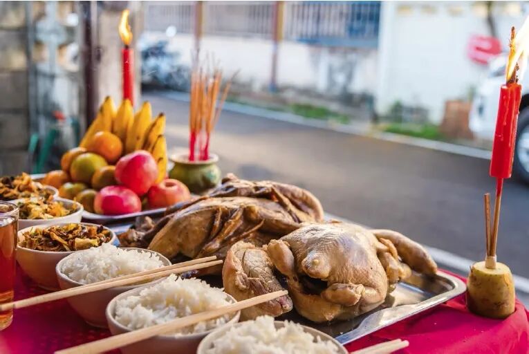祭祀活动几乎贯穿客家人的整个春节。从年二十七到年二十九,客家人要祭祀“伯公”“伯婆”和“村神”等守卫一方的小神,通常由老年妇女或青年媳妇带着小孩去祭拜。大年三十,客家人要带上“三牲”“斋盘”,去祖祠祭拜祖先。“三牲”主要是指猪、鸡和鱼,“斋盘”分别盛有发粄(寓意“年年发财”)、苹果(寓意“四季平安”)、柑橘(寓意“年年吉利”)、柚子(寓意“年年富有”)和财宝(纸钱等)。这是过年非常隆重的一项习俗,也是客家人雷打不动的仪式。此时,家族成员都会返回祖屋,焚香叩首,祭拜祖先,追思祖先功德。