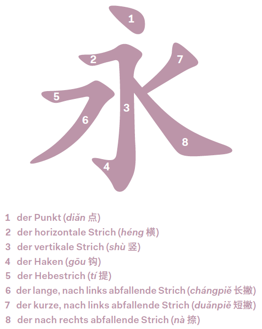Das grundlegende Element eines chinesischen Schriftzeichens sind die Striche. Die „Acht Prinzipien des Schriftzeichens Yong“ (Yǒngzì bāfǎ) beschreiben die acht Basisstriche der Regelschrift:
