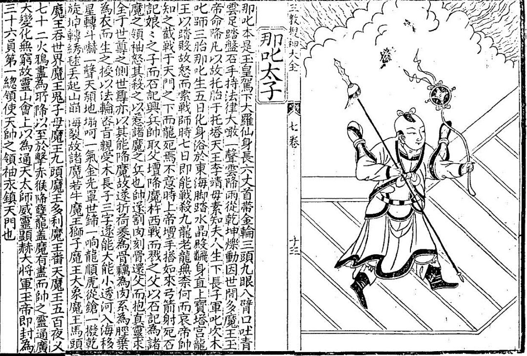 到了元代,哪吒的故事从佛教信仰者的布道变成了道教文化的叙事,内容更加丰富。《三教源流搜神大全》是中华文化多元融合的重要文献,其中《哪吒太子》篇记载:因世界多魔王,玉帝派其下凡,脱胎于李天王李靖夫人。后来的《西游记》和《封神演义》便是人们熟悉的故事了。这些故事基本上都是从《三教源流搜神大全》之“哪吒太子”故事演绎开去的。
