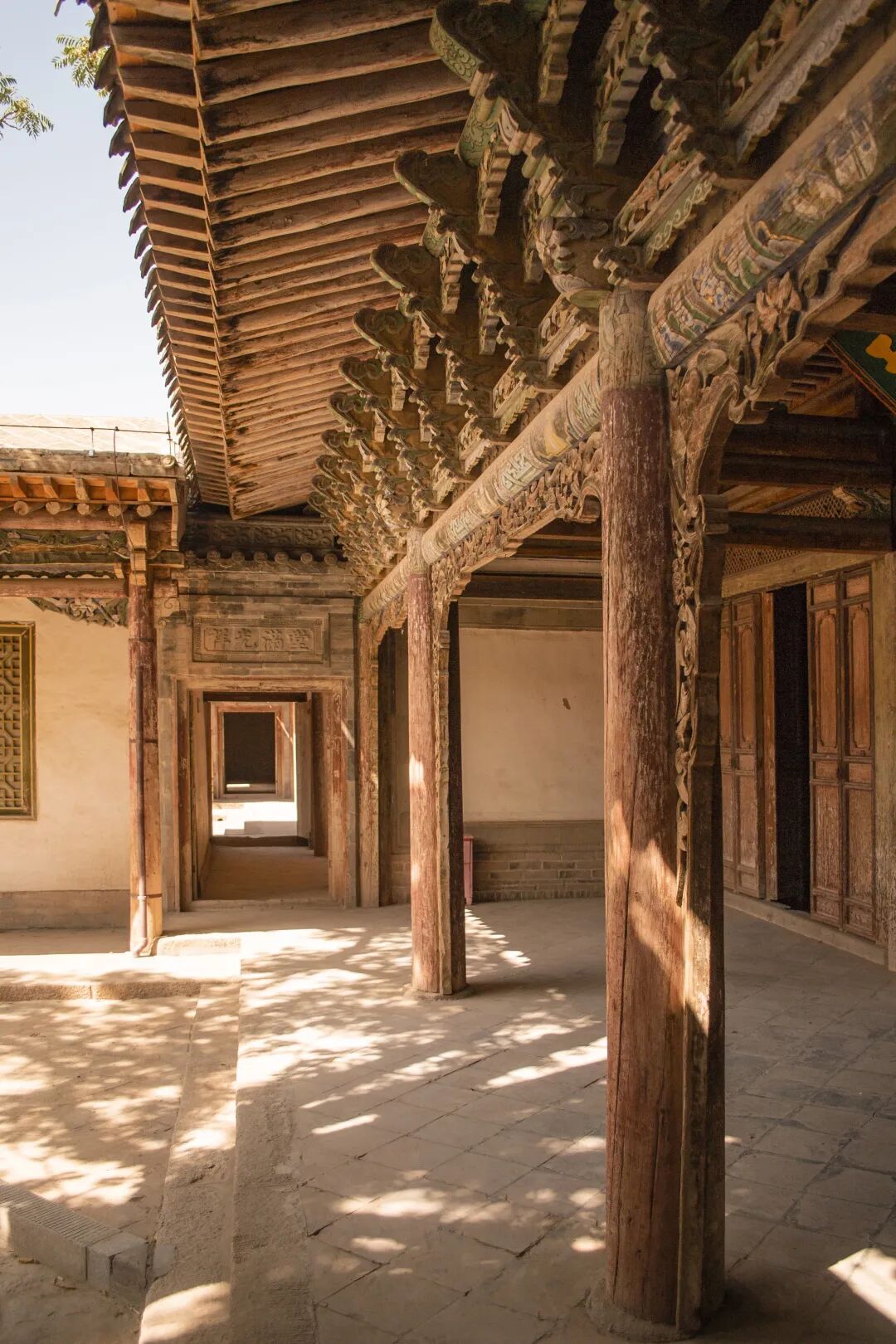 院落中的带顶拱廊为人们遮挡炽热阳光,带来阴凉。