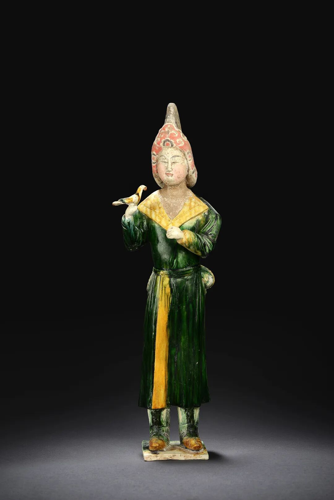 唐 三彩戴胡帽调鸟女立俑
