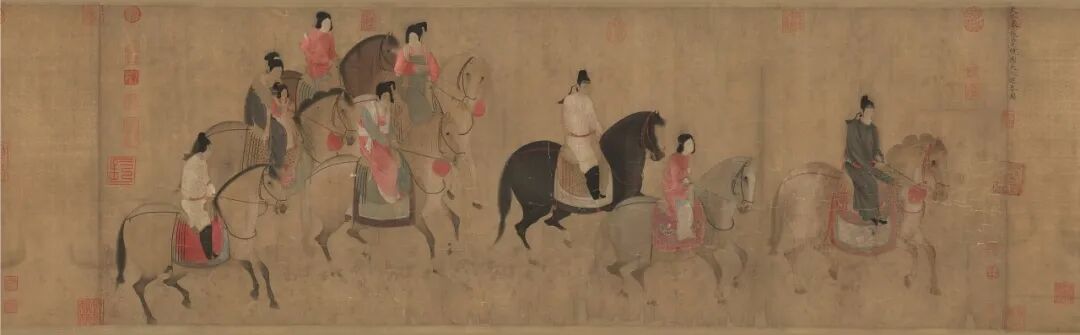 唐代画家张萱的《虢国夫人游春图》生动描绘了唐代贵族女性虢国夫人和秦国夫人在春日里出游的欢乐景象。画面中,她们神色悠闲欢愉,所骑骏马英姿飒爽,充满了欢快的春天气息。