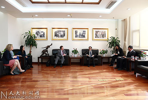 英国谢菲尔德大学国际事务部副主任多特·史蒂文森、谢菲尔德大学孔子学院院长露西·赵、北京办公室项目经理刘宇宁等一同来访。中国人民大学科研处处长严金明、副处长刘金龙等参加会谈。