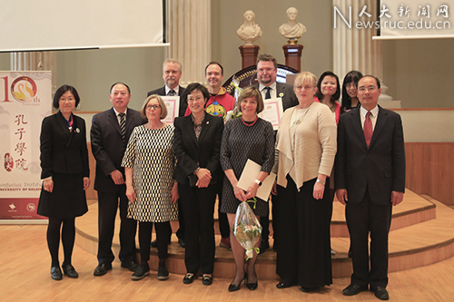 开幕式上,赫尔辛基大学孔子学院外方院长陈玉文、中方院长王红一同向给予孔子学院大力支持的赫尔辛基大学副校长安娜·莫兰恩,世界文化系主任、孔子学院理事会成员拉尔斯•福克•兰德睿(Lars-Folke Landgrén),世界文化系俄罗斯与东欧研究副教授Arto Luukkanen,“愤怒的小鸟”之父、芬兰路威(Rovio)软件公司联合创始人彼得·维斯特巴卡(Peter Vesterbacka)颁发杰出贡献奖。大家一同观看了赫尔辛基大学孔子学院精心准备的十周年纪念视频,并欣赏了赫声合唱团(Helsinging Choir)的精彩表演。赫尔辛基大学主楼一层大厅举办了中国人民大学建校80周年主题展,吸引了赫尔辛基大学的众多师生前来观看。开幕式前,靳诺书记参观了位于赫尔辛基大学的国家图书馆(National Library)及赫尔辛基大学主图书馆(Kaisa Library)。