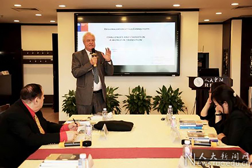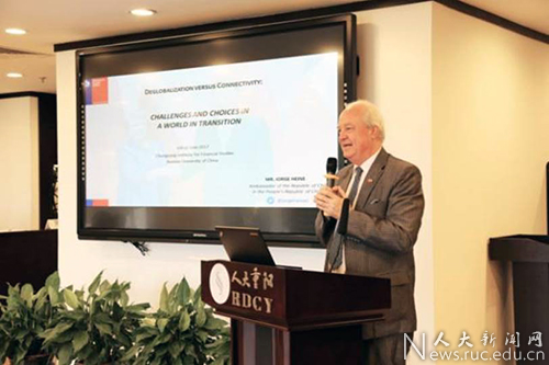 6月6日下午,智利驻华大使贺乔治(Jorge Heine)博士应邀在中国人民大学重阳金融研究院举行讲座,主题为“去全球化 Vs. 互联互通:转型世界的挑战与选择”。中国人民大学重阳金融研究院研究员、央视英语新闻频道评论员韩桦女士致欢迎词,中国日报专栏作家、原美国卡特总特任期白宫法律顾问哈维·佐丁,智利驻华使馆三等秘书劳尔·里韦拉,中国人民大学教授李庆四,中国国际广播电台西欧拉美地区传播中心西班牙语部记者万戴参加讲座。