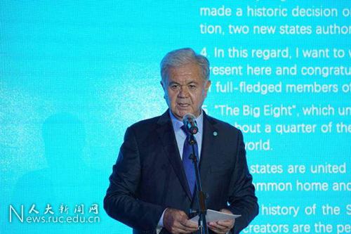 阿利莫夫秘书长在致辞中表示,在不久前举行的阿斯塔纳峰会期间,上合组织创始国元首做出历史性决定,印度、巴基斯坦正式成为上合组织成员国。此次扩员后,涵盖近一半的世界人口和四分之一国土面积的上合组织,掀开了新的历史篇章。