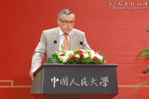 国外高校代表、法国蒙彼利埃保罗-瓦莱里大学校长帕特里克·基利代表中国人民大学中法学院的三所合作院校法国巴黎索邦大学、蒙彼利埃保罗-瓦莱里大学、凯知商学院致辞。他表示,法国蒙彼利埃保罗-瓦莱里大学与中国人民大学具有相近的办学传统,持有共同的价值观,中法学院这项成功的合作事业印证着法中两国的友谊。希望蒙彼利埃保罗-瓦莱里大学及其他法国伙伴院校和人民大学继续携手并肩,进一步加强合作,共同面向未来。