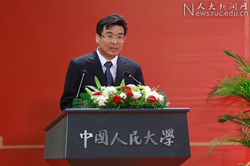 中国人民大学校长刘伟致辞。他指出,中国人民大学80年的发展历程,是对中国共产党独立创办的具有红色基因的高校能否建设中国特色世界一流大学、对在中国这样一个经济发展相对落后的国家能否建设中国特色世界一流大学、对以人文社会科学为主的高校能否建设中国特色世界一流大学等一系列重大命题所作出的深刻的历史回应。党的十八大以来,在党中央的亲切关怀下,在教育部和北京市的正确领导下,中国人民大学认真学习贯彻习近平总书记系列重要讲话精神和治国理政新理念新思想新战略,取得了显著成绩。2017年,中国人民大学正式入选“世界一流大学和一流学科”建设名单,14个学科进入世界一流学科建设名单。