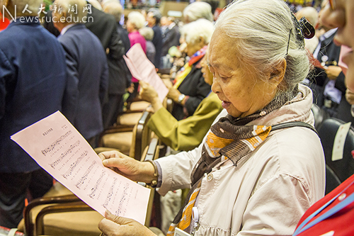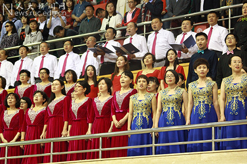 在激越昂扬的《陕北公学校歌》中,中国人民大学建校80周年庆祝大会圆满结束。“努力!努力!争取国防教育的典范;努力!努力!锻炼成抗战的骨干。我们要忠实于民族解放事业,我们献身于新社会的建设,昂头看那边,胜利就在前面!”激昂的声音,久久回荡在世纪馆上空。
