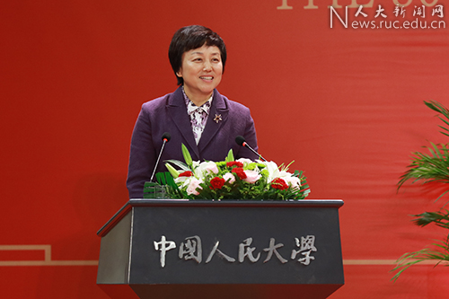刘延东回顾了自己在人大的求学时光,并表示为学校蒸蒸日上的发展面貌感到由衷的喜悦和欣慰。她指出,中国人民大学以执着的努力,以令人瞩目的业绩,切实履行了为人民服务、为中国共产党治国理政服务、为巩固和发展中国特色社会主义制度服务、为改革开放和社会主义现代化建设服务的办学宗旨,没有辜负党中央的信任、人民的期盼和重托。