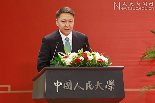 吉尔吉斯斯坦驻华大使阿扎马特·乌谢诺夫作为留学生校友代表发言。他表示,自己时常怀念19年前作为第一批吉尔吉斯斯坦公派留学生来到人民大学的美好求学经历。今年是母校建立80周年,也是习近平总书记提出“一带一路”倡议的黄金发展阶段。在两国领导人的积极推动下,吉中两国围绕“一带一路”建设取得了显著成绩。希望吉尔吉斯斯坦和中国的友好关系能够在“一带一路”倡议下更加密切,他将尽己所能为两国友谊贡献力量。