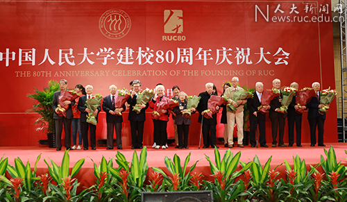 庆祝大会上,学生代表为陕北公学时期老校友、原中组部秘书长何载;华北联大时期老校友、著名歌唱家孟于,著名表演艺术家田华,原中国人民大学校长黄达;华北大学时期老校友、著名歌唱家胡松华,原陕西省委书记、省长张勃兴,著名学者卫兴华、高放、陈共;中国人民大学老教授邬沧萍、方汉奇、高铭暄等12位不同时期的老校友、老教授代表佩戴校徽并敬献鲜花,以感谢和铭记各位老校友、老教授为国家建设和学校事业发展作出的贡献。