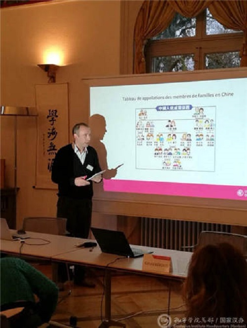 孔院在读博士生梁定远(Pierrick Porchet)向听众介绍了瑞士和中国的家庭风俗的异同。他认为,两国的农村和城市对家庭的理解都不一样,而且,两个国家几十年以来的家庭风俗也都有所改变。现在,在两个国家都可以遇到所谓的“传统家庭”以及“现代家庭”。他认为目前中国家庭的主流思想以儒家思想为基础,这一点特别表现在农历节日中,同时也表现在大众传媒比如电视剧、电影以及广告片当中。
