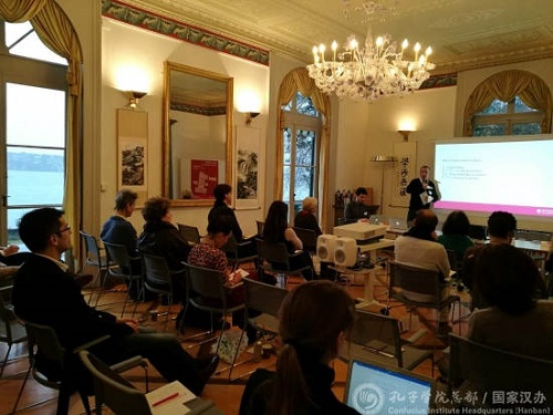 日内瓦孔院外方副院长谢红华介绍了瑞士从50年代延续至今的汉语教学历史,同时对瑞士汉语教学的现状作了比较全面的总结。她重点介绍了苏黎世大学和日内瓦大学汉学系的汉学研究,以及瑞士两个孔子学院对中国文化与汉语推广所做的工作。她从国情和教学本身分析了瑞士汉语教学面临的挑战,最后,通过当今中国在世界上的地位和瑞中两国的经济交往的角度,说明中瑞互相理解、互赢互利的前提是学习对方的语言与文化,瑞士与中国应该携手合作,共同为瑞士人提供学习汉语的优良条件。