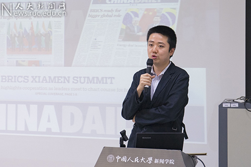 本次沙龙上半场为演讲环节,6位赶赴厦门参与金砖会议报道的中外记者从自身经历出发,与大家分享报道过程中的收获与经验。张陨璧介绍,中国日报金砖峰会官方会刊在会议期间一共出版3期,共24页,120篇文章。金砖峰会官方会刊丰富的信息、对重要人物的采访以及精美的信息图表得到了中外人士的广泛好评。他表示,在金砖峰会报道中,中国日报十分重视对一手材料的使用,针对不同媒介平台特点采用不同的媒介产品,还发现了许多官方发布中没有提到的新闻点。他与大家分享了中国日报的金砖峰会报道策略。