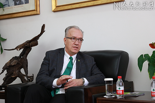 杜鹏首先欢迎代表团一行,并介绍了中国人民大学的历史沿革和优势学科等情况。他表示,人民大学被公认为中国人文社科领域的一面旗帜,同时兼具精干的理工学科。经济学、法学、政治学、管理学、新闻传播学等多个学科位居全国高校领先地位。北德克萨斯州大学音乐学院极负盛名,中国人民大学现有9名音乐系毕业生正在北德克萨斯大学音乐学院攻读硕士或博士学位,双方教师也开展了一系列高水平学术交流活动。杜鹏表示,中国人民大学愿继续推动与北德克萨斯州大学的师生交流项目,进一步深化合作。