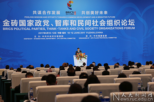 6月10-12号,由中联部主办、中共福建省委承办的“金砖国家政党、智库和民间社会组织论坛”在福州举行。中共中央政治局常委、中央书记处书记刘云山出席开幕式并作重要讲话,共有来自26个国家的37个政党、105家智库、79家民间社会组织400余名代表与会。这是金砖国家领导人峰会十年来首次举办政党、智库、民间社会组织三合一论坛,也是有史以来最大规模的金砖峰会配套活动。
