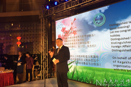 3月20日晚,由上海合作组织秘书处、中国联合洲际基金会主办,北京外国问题研究会、复华标准生命公司等承办的纳乌鲁兹节庆祝会在北京飞天大厦举行。上海合作组织秘书长拉希德·阿利莫夫、哈萨克斯坦驻华大使沙赫拉特·努雷舍夫先后致欢迎词,中国外交部部长助理李惠来,上合组织副秘书长王开文,上合组织各成员国、观察员国和对话伙伴国驻华使节以及中国各界代表数百人出席。