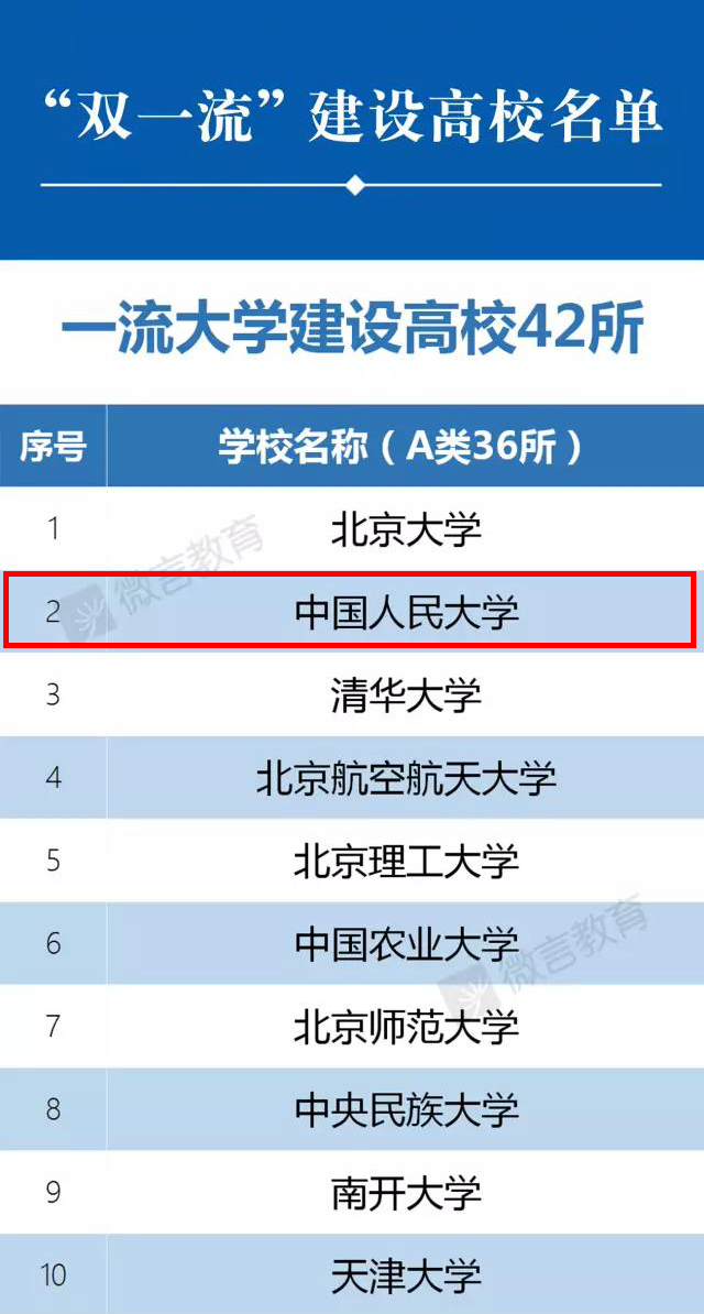 日前,教育部、财政部和国家发展改革委经国务院批准下发《关于公布世界一流大学和一流学科建设高校及建设学科名单的通知》,公布世界一流大学和一流学科建设高校及建设学科(简称“双一流”)名单。其中,一流大学建设高校42所(A类36所、B类6所),一流学科建设高校95所。