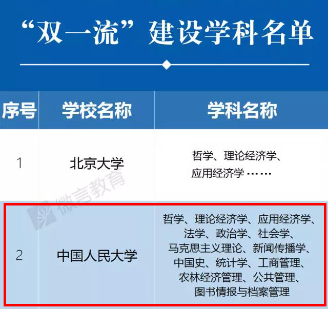 中国人民大学入选 A 类一流大学建设高校名单,哲学、理论经济学、应用经济学、法学、政治学、社会学、马克思主义理论、新闻传播学、中国史、统计学、工商管理、农林经济管理、公共管理、图书情报与档案管理共14个一级学科入选一流学科建设名单。入选学科除统计学为理学学科外,其余全部为人文社会学科。