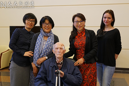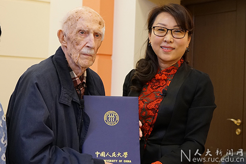齐赫文斯基院士是俄罗斯汉学界泰斗,也是资深外交家。他曾于上世纪五十年代受吴玉章老校长的邀请,在人民大学讲述国际法、国际关系等课程,并参与培养了新中国的第一批外交官。作为人民大学八十周年校庆的重要组成部分,经俄罗斯研究中心多番努力联系,齐赫文斯基院士欣然同意受聘中国人民大学名誉教授并参与校庆活动。但由于他已99岁高龄,不便来校,关雪凌教授赴俄罗斯拜访了齐赫文斯基院士,转呈了靳诺书记和刘伟校长的邀请信,并颁发了聘书。