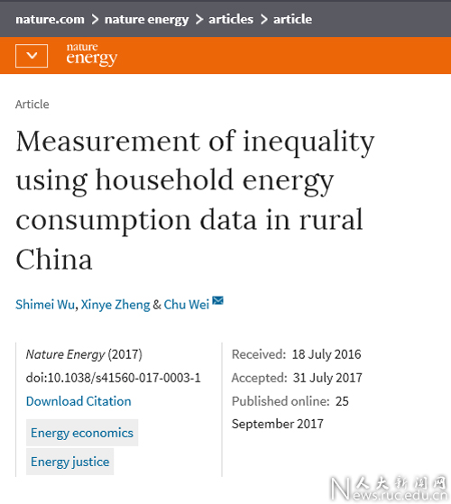 9月25日,国际顶级刊物《自然》出版集团旗下子刊《Nature Energy》杂志以研究论文(Article)形式在线发表了中国人民大学经济学院能源经济系课题组重要研究成果“Measurement of inequality using household energy consumption data in rural China”。同期还刊发了英国东英吉利大学教授、剑桥大学高级研究员Guan Dabo专门撰写的评论文章“An index of inequality in China”。中国人民大学经济学院能源经济系直博研究生吴施美是论文的第一作者,能源经济系郑新业教授、魏楚教授分别为第二作者和通讯作者。该论文是中国人民大学首篇在该刊上发表的研究论文,也是学校非理工科学者首次在《自然》子刊上发表的研究论文。