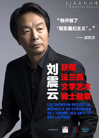 4月13日,中国人民大学文学院教授、中国当代著名作家刘震云被法国文化部授予“法兰西共和国文学与艺术骑士勋章”,以表彰他的作品在法文世界产生的影响。当晚,法国驻华大使馆在北京法国文化中心举办刘震云教授的文学之夜暨授勋仪式。法国驻中国大使黎想(Jean-Maurice Ripert) 代表法国文化部向刘震云教授颁发荣誉勋章和证书。