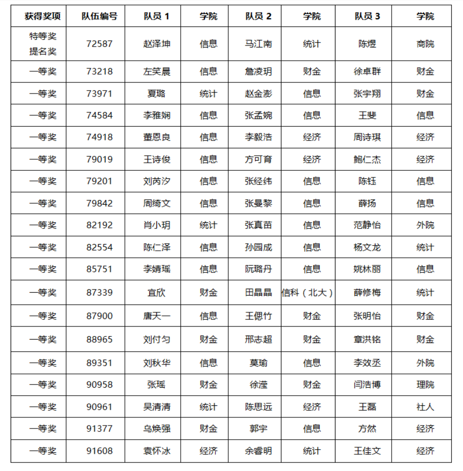 在中国人民大学所有参赛队伍中,共有60支队伍获奖。其中赵泽坤(信息学院),马江南(统计学院)和陈煜(商学院)三位同学组成的队伍获得特等奖提名奖(Finalist,Winner,全球前23名),是继2014、2016年之后,第三次荣获该奖项。学校获一等奖队伍数由2017年的13支队伍,增长至18支队伍,取得较大的进步,另有41支队伍获得二等奖,获奖队伍数连续增长。