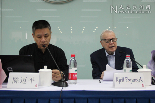 5月12日下午3点,诺贝尔文学奖评委会前主席、瑞典学院终身院士、国际著名作家、诗人、评论家埃斯普马克先生于逸夫会议中心第二报告厅举办“国际现代主义和本土传统的会面”专题讲座。本次讲座围绕如何在维护本土语言文学的同时接受外来刺激、汲取国外文学,探讨本土与外来文学艺术如何寻求平衡、融合发展。中国人民大学文学院院长孙郁教授及著名作家刘震云教授出席并主持本次讲座,著名作家、中国人民大学文学院教授阎连科参加本次讲座,著名翻译学家陈迈平先生担任现场翻译,此外,梁鸿、杨庆祥、林岚等多名学者、教授、作家也出席了本次讲座。