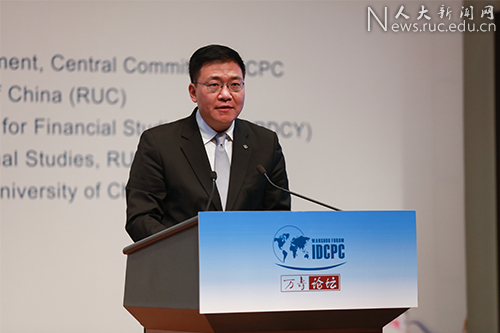靳诺在致辞中表示,习近平新时代中国特色社会主义思想,深刻体现了中国共产党“中国人民谋幸福、为中华民族谋复兴、为人类谋和平与发展”的理念,特别是鲜明提出构建人类命运共同体的主张,是中国共产党的又一次重大理论创新,不仅具有深刻的理论价值,而且具有重要的实践价值;不仅对中国具有指导意义,而且对世界具有借鉴意义。这一理论思想为理解中国未来道路和发展方向、为广大发展中国家解决自身问题、为解决当今世界面临的共同问题提供了一把钥匙。我们愿意为全球共同研究习近平新时代中国特色社会主义思想搭建学术和思想交流平台。中国人民大学将作为这一思想的研究中心,以重要智库重阳金融研究院等研究机构和智库为依托,与更多海内外力量共同展开对这一思想的研究。