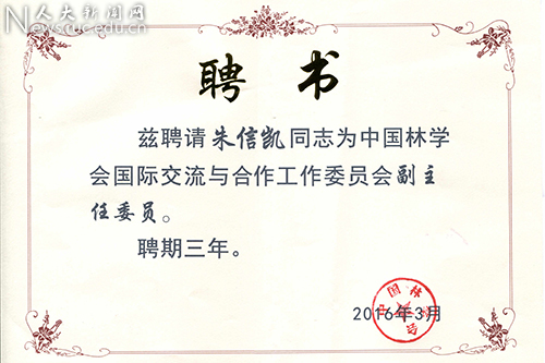 此次会议提议并通过了增补工作委员会副主任委员、顾问及中国林学会国际咨询专家的决议,聘请朱信凯教授为中国林学会国际交流与合作工作委员会副主任委员。中国林学会副理事长、国际合作与交流工作委员会主任委员、中国林业科学研究院院长张守攻为朱信凯教授颁发了聘书。