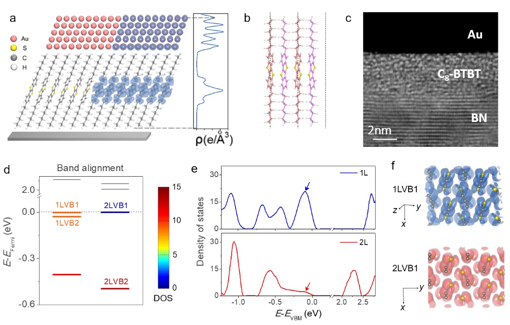 图d:1L, 2L C8-BTBT与金电极的能级分布。图e:1L, 2L C8-BTBT电子态密度。