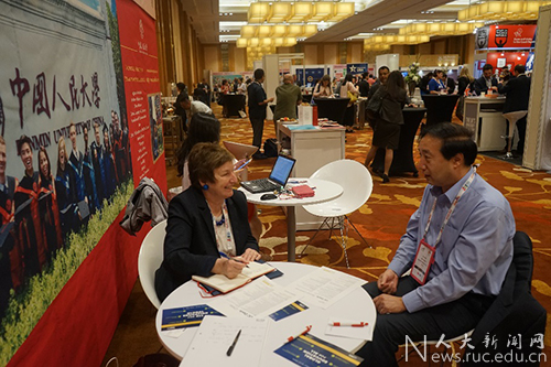 会议期间,共有近60余所海外高校参观人民大学展位,询问学生交换项目、暑期学校、英文课程情况,就扩大合作领域、创新合作形式、提高合作质量等问题与代表团进行交流。