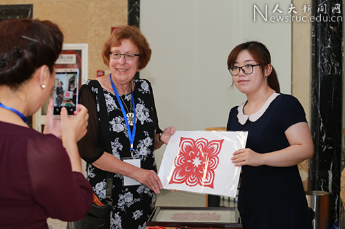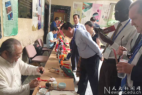 研讨会后,与会人员在逸夫会议中心观看、体验北京非物质文化展示。杨玉栋、杨东海、杨利平、杨钺、黄左辰五位北京非物质文化遗产手艺人分别通过京剧盔头彩塑脸谱、卵石画、北京扎燕风筝、剪纸和榫卯技艺为与会人员展示了具有北京特色的非物质文化遗产。