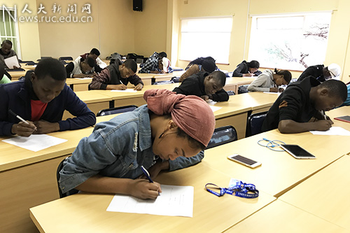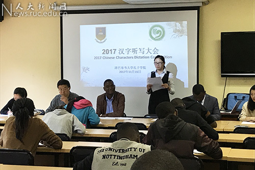 11月15日,津巴布韦大学孔子学院如期举行了津大孔院第一届汉字听写大会。在大会筹备阶段,孔院各任课教师先行在各自的班级中组织了预选赛,每个班选出4名最优秀的学生代表参加15日的汉字听写大会,当天共20名学生代表参加了本次汉字听写大会。汉字听写大会分三个环节进行。每个环节有20个汉字听写题目,由孔院教师张明玉进行听写,听写完所有题目后,孔院教师现场打分,并按成绩排名淘汰半数参赛选手。